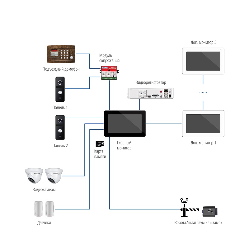К монитору можно подключить до 5 дополнительных мониторов или использовать его в качестве дополнительного к другим совместимым мониторам Novicam. При подключении нескольких мониторов становится доступной функция адресного интеркома. Это позволяет общаться в пределах одной системы, а также переадресовывать вызов с внешней панели на другой монитор.
