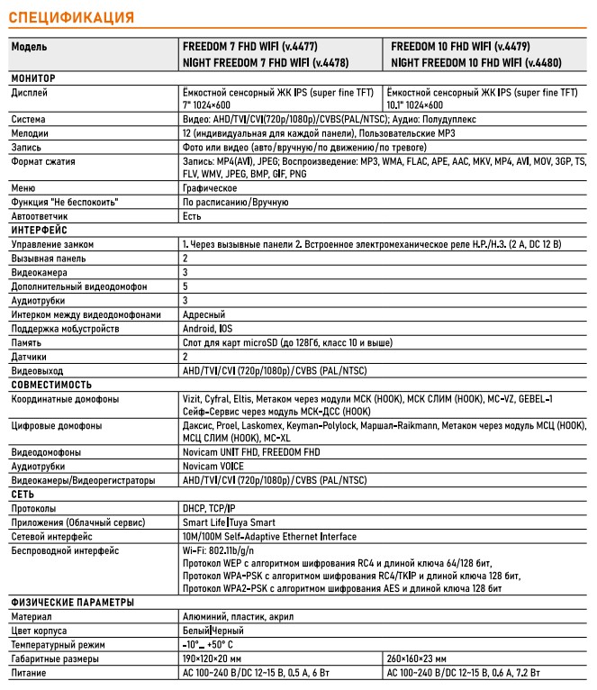 FREEDOM 7 FHD WIFI (ver.4477) видеодомофон Full HD Novicam; сенcорный HD IPS (super fine TFT) дисплей 7”; 1024х600; AHD/TVI/CVI(720p/1080p)/CVBS(PAL/NTSC); поддержка 5 доп.мониторов; 3 видеокамер и 2 датчиков; 2 вызывных панелей; интерком между мониторами адресный; MicroSD (до 128Гб, класс 10 и выше); встроенное электромеханическое реле; цв. белый; материал пластик, акрил, алюминий; -10°...+50°С; 190х120х20 мм.