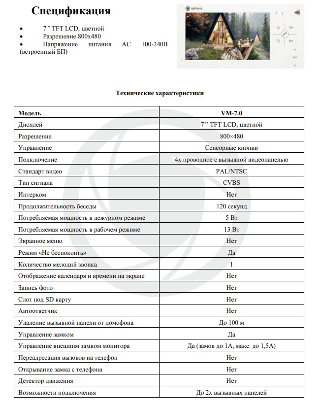 VM-7.0 видеодомофон Optimus; 7’’ TFT LCD, цветной дисплей, 800×480; PAL/NTSC; CVBS; АС 100-240В; 0°...+60°С; 234x120x19 мм; 377 г.