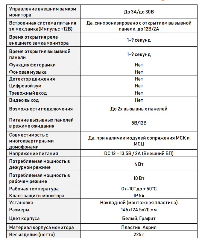 Поддержка режима 5В/12В питания вызывных панелей в режиме ожидания. Комплектация: Видеодомофон – 1 шт. Монтажный комплект – 1 шт. Комплект проводов для подключения – 1 шт. Кронштейн для видеодомофона – 1 шт. Блок питания для видеодомофона- 1 шт. Руководство пользователя – 1 шт. Коробка - 1 шт.