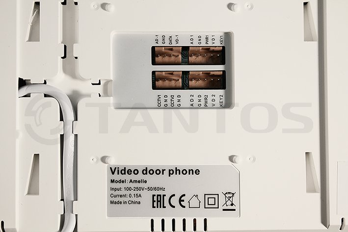 Amelie (White) видеодомофон Tantos; цв. TFT LCD 7"; PAL/NTSC; Hands-Free; сенсорные кнопки; 2 панели, 2 камеры, до 4-х шт. в параллель; индивидуальный/ многоквартирный режимы; режим <не беспокоить>; 220В; 50мА; цв. белый; 210х116х25 мм; 450 г.