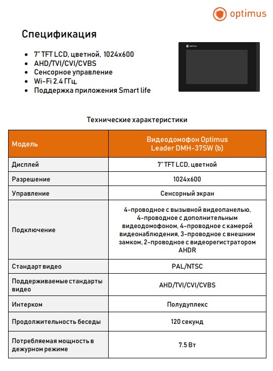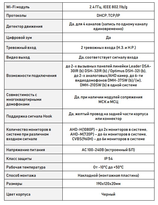 Leader DMH-37SW (b) видеодомофон Optimus; 7” TFT LCD, цветной, 1024x600; AHD/TVI/CVI/CVBS; сенсорное управление; детектор движения; слот под SD карту до 128 Гб; Wi-Fi 2.4 ГГц; поддержка приложения Smart life; DHCP, TCP/IP; IP54; от -10°С до +50°С; 190х120х20мм; 420 г.