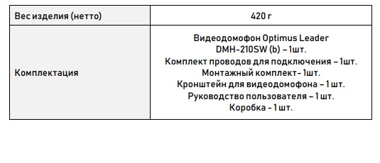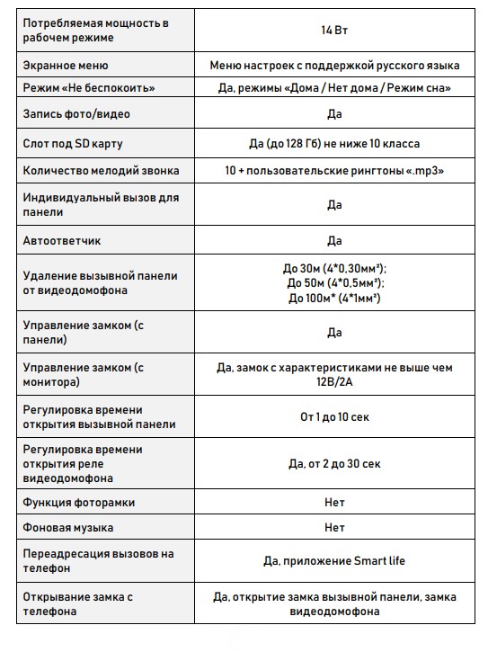 Видеодомофон поддерживает стандарты видео PAL/NTSC. Продолжительность беспрерывной беседы достигает 2 минут. Вызывная панель при этом может располагаться от видеодомофона на расстоянии до 100м. К домофону возможно подключить 2 вызывные панели. С монитором совместимы 4-проводные вызывные видеопанели. Количество мониторов в системе: 1 основной и до 6 дополнительных.