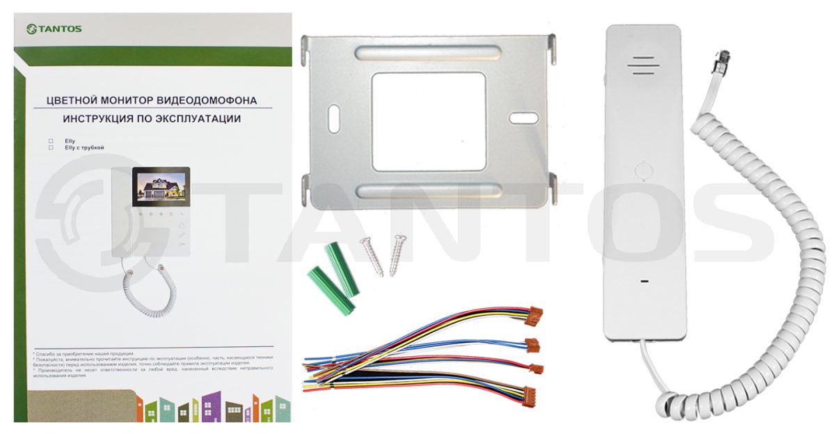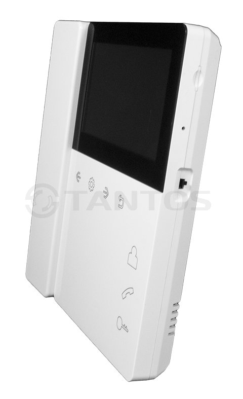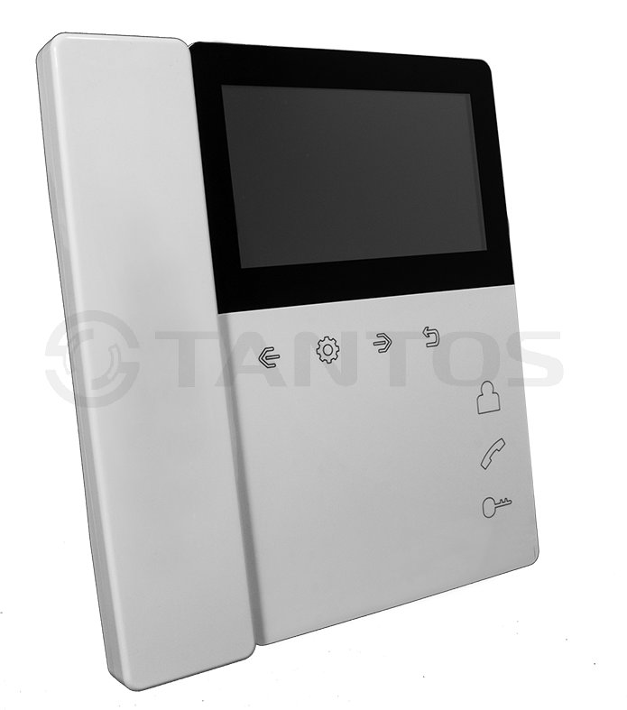 Elly монитор видеодомофона с трубкой Tantos; TFT LCD 4,3" 480x272; PAL/NTSC; сенсорные кнопки; 2 панели; трубка/ Hands-Free; до 4-х шт. в параллель; возможность открывания замка калитки и ворот при использовании одной вызывной панели при подключении реле TS-NC05; индивидуальный/многоквартирный режим; режим прослушивания других мониторов; белый; 0...+40°С; 160х180х32 мм; 368 г.