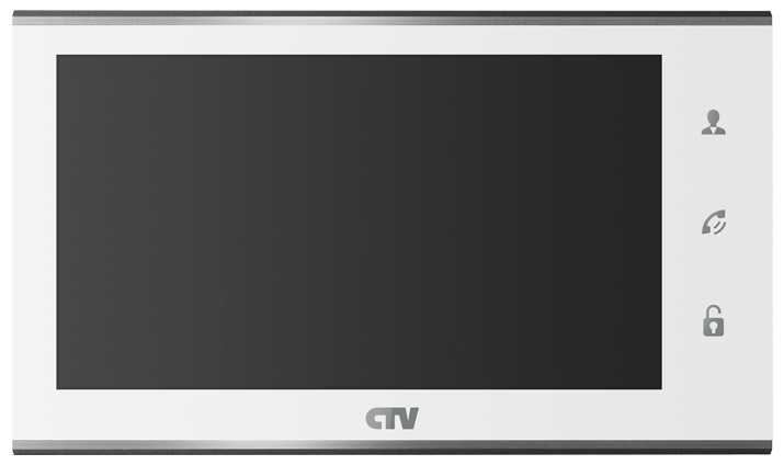 CTV-M2702MD W монитор цветного видеодомофона с экраном 7"; TFT IPS LCD (16:9); 1024x600; PAL/NTSC; Hands free; сенсорная панель; возможность объединения до 4 мониторов в системе, до 2-х вызывных панелей, до 2-х дополнительных охранных видеокамер; поддержка режима интеркома; встроенный детектор движения; панель из стекла с сенсорным управлением "Easy buttons"; встроенная память 16 мб. (только фото); microSD-card Class10; цвет корпуса монитора: белый; -10...+60°С; 192,5x112,8x19,8 мм; 0,5 кг.