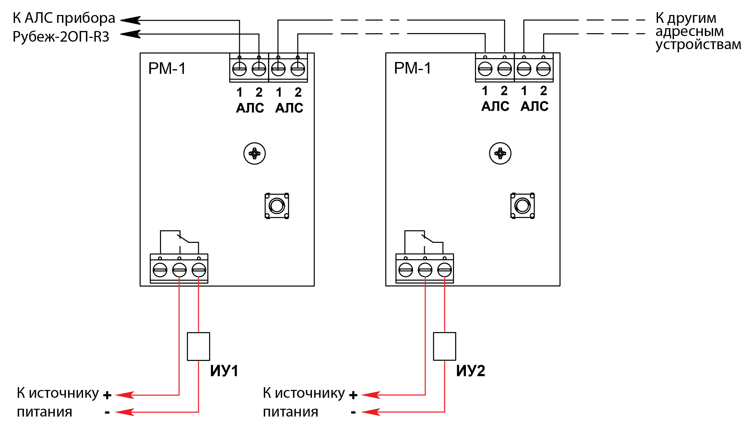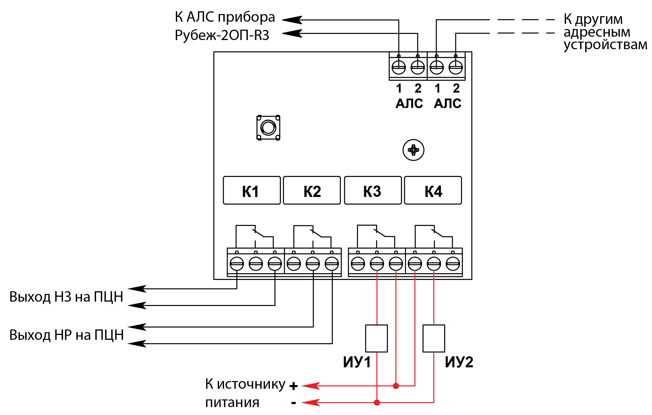 Питание релейного модуля и передача сигналов на приемно-контрольный прибор осуществляются по униполярной адресной линии связи.