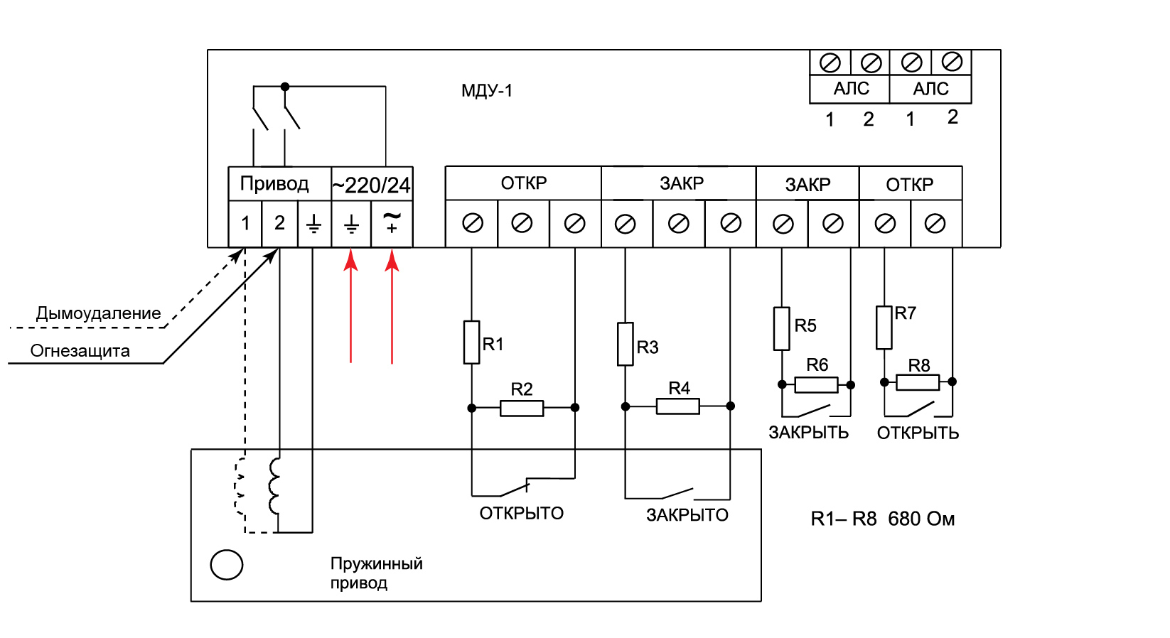 подключение всех основных типов приводов, используемых с клапанами дымоудаления;