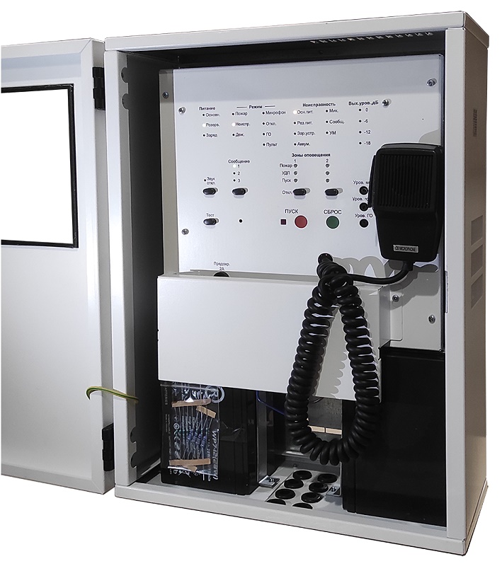 В данном устройстве реализованы функции управления и индикации оповещения, усиления мощности, блока коммутации и контроля, зарядное устройство, отсек под АКБ.