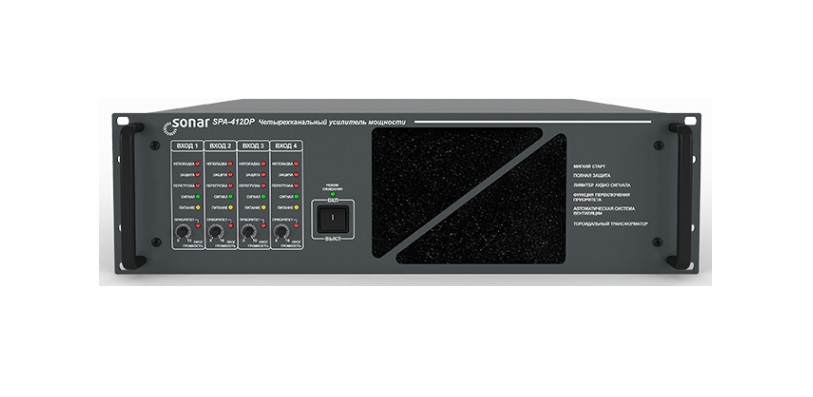 Sonar SPA-412DP - Усилитель мощности трансляционный, выходная мощность 4*120 Вт, с приоритетным и программным входом, защита от КЗ и перегрузки по току, защита от бросков напряжения, подключение дополнительных модулей SFD-200 (контроль линии), потребление 1300 Вт.
