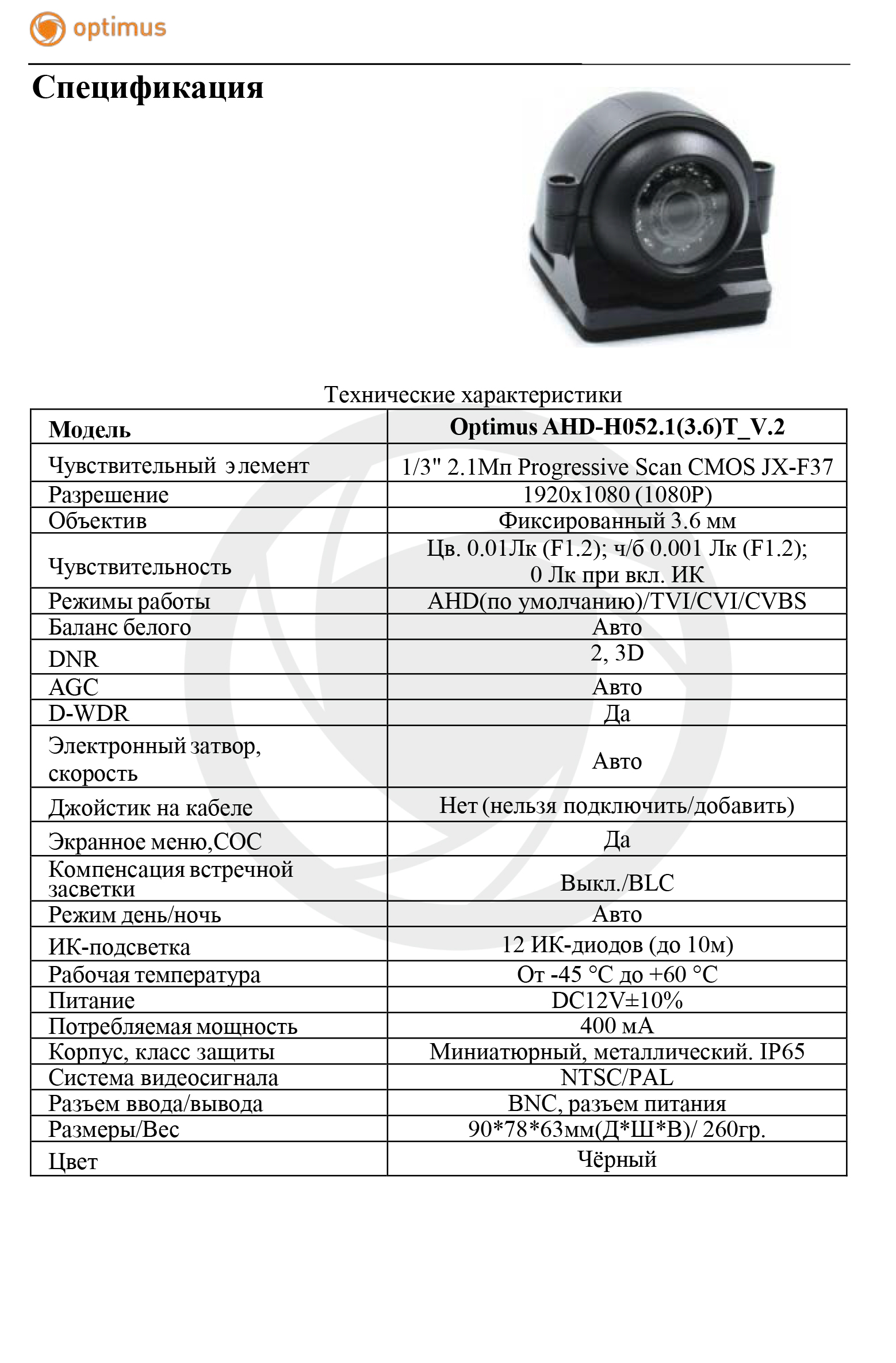 AHD-H052.1(3.6)T_V.2 камера видеонаблюдения для транспорта Optimus; 1/3" CMOS Progressive Scan JX-F37 2.1Мп; 1920х1080 (1080P); AHD(по умолчанию)/TVI/CVI/CVBS; объектив фиксированный 3.6 мм; ИК-подсветка 10 м, 12 ИК-диодов; D-WDR; цвет чёрный; от -45 °С до +60 °С; корпус миниатюрный металлический, IP65; 90x78x63 мм; 260 г.