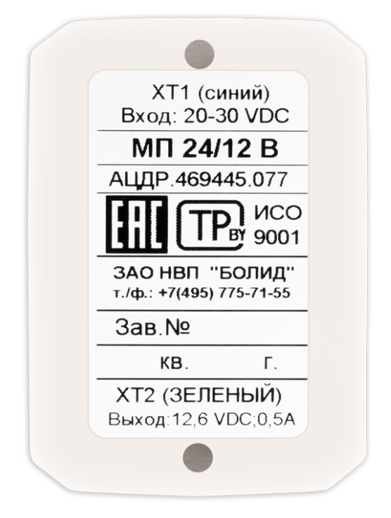 МП 24/12 В узел преобразователя напряжения Болид; 12,6±0,6 В; 0,5 А; -30...+50 °C; 38×55×20 мм; 0,1 кг.