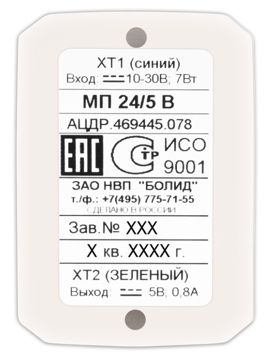 МП 24/5В модуль преобразователя Болид; 0,8 А; 5±0,25 В; -30...+50 °C; 38×55×20 мм; 0,1 кг.