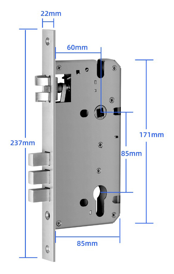 Врезной замок 6085 Novilock v.4938 механизм для распашных дверей; нержавеющая сталь; функция No key; смена направления защелки; 237х85х22 мм.