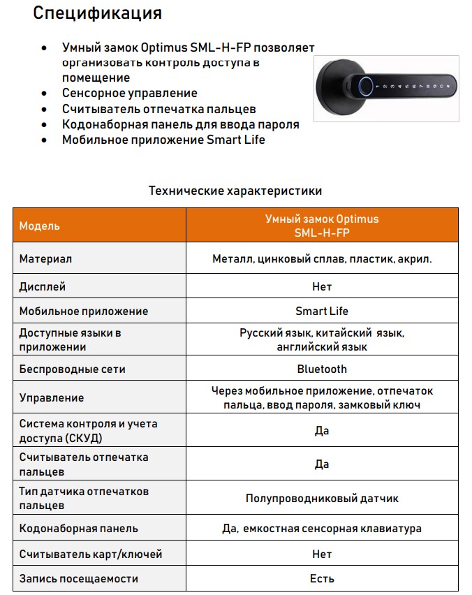Умный замок Optimus SML-H-FP позволяет организовать контроль доступа в помещение.