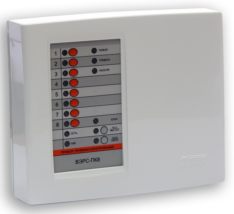 ВЭРС-ПК 8П - прибор приемно-контрольный охранно-пожарный, 8 охранно-пожарных ШС, 2 реле ПЦН, выходы на оповещатели с контролем линий оповещения, гибкое программирование прибора, клеммы для подключения внешнего РИП, АКБ 4,5Ач; пластмассовый корпус; АКБ в комплект поставки не входит.